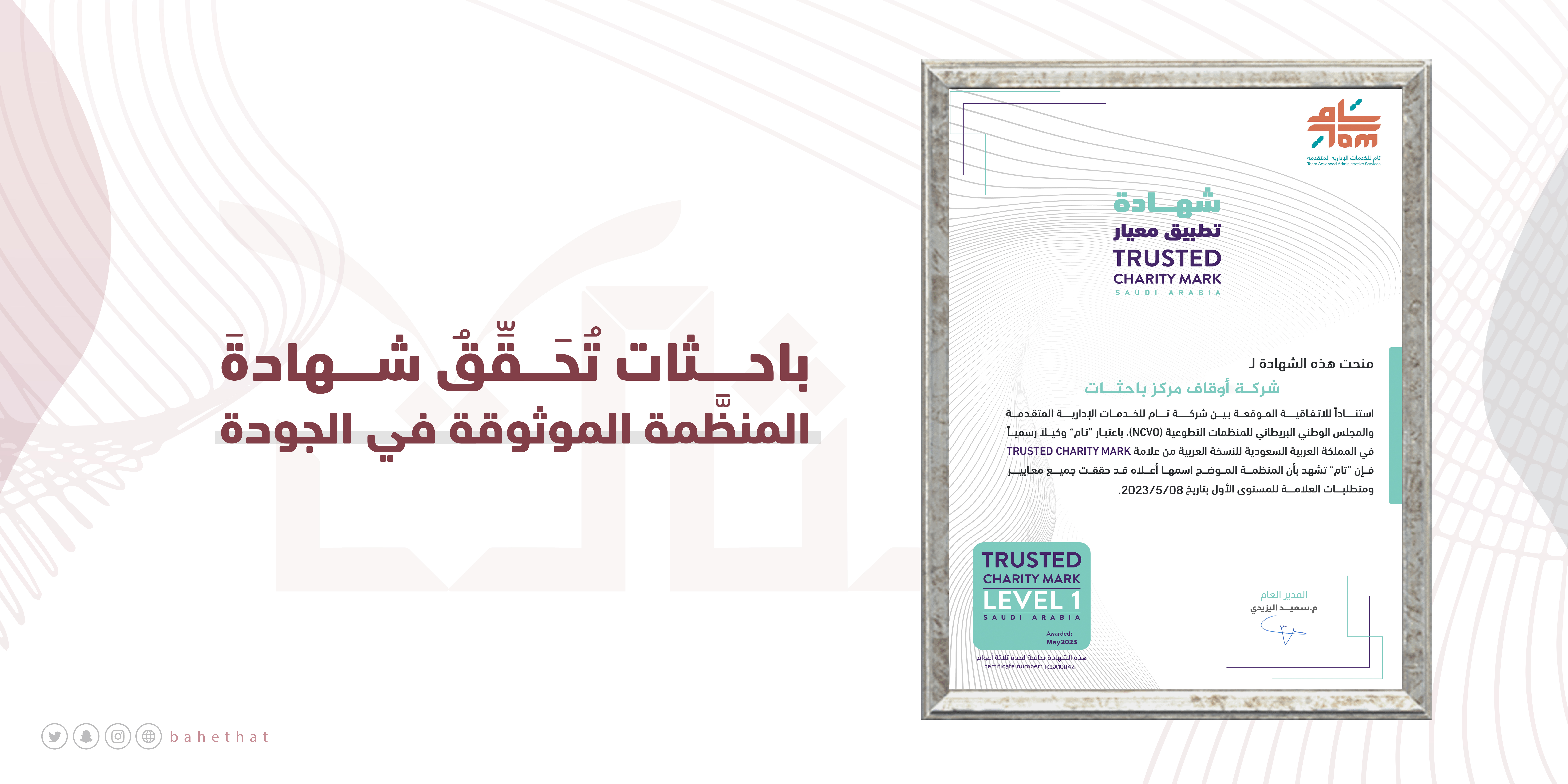 بحمد الله حصلت شركة أوقاف مركز باحثات على شهادة ( المنظمة الموثوقة TRUSTED CHARITY MARK )